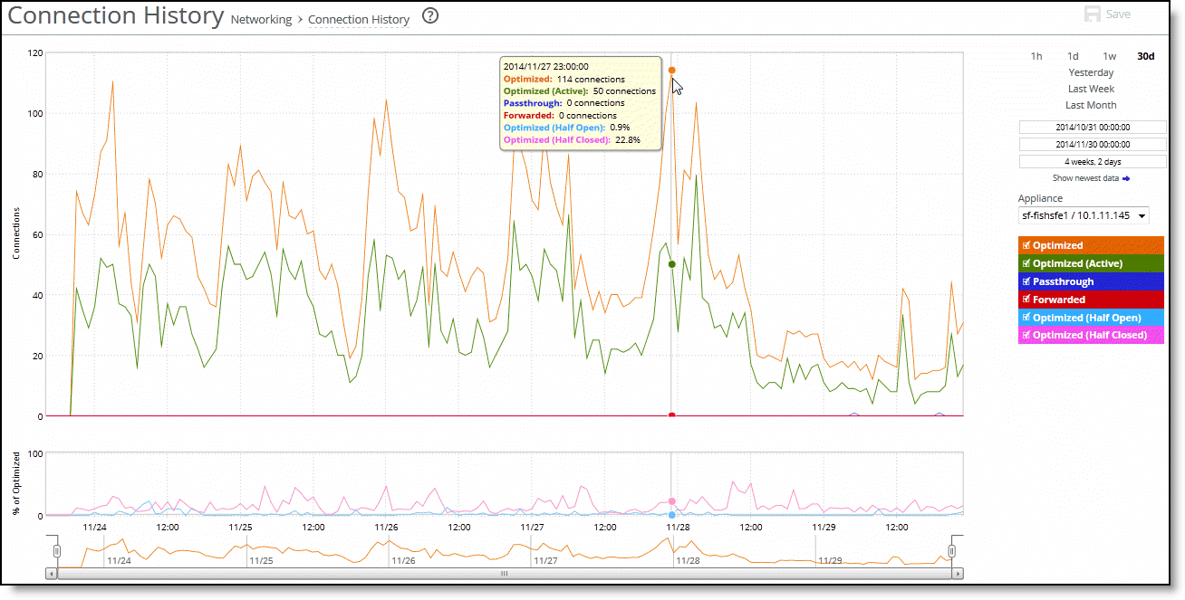 Displays the percentage of half-closed active connections represented in the optimized connection total. Half-closed connections are connections that the SteelHead has intercepted and optimized but are in the process of being disconnected. These connections are counted toward the connection count limit on the SteelHead. Half-closed connections can remain if the client or server doesn’t close their connections cleanly. If you’re experiencing a large number of half-closed connections, consider a more appropriately sized SteelHead.