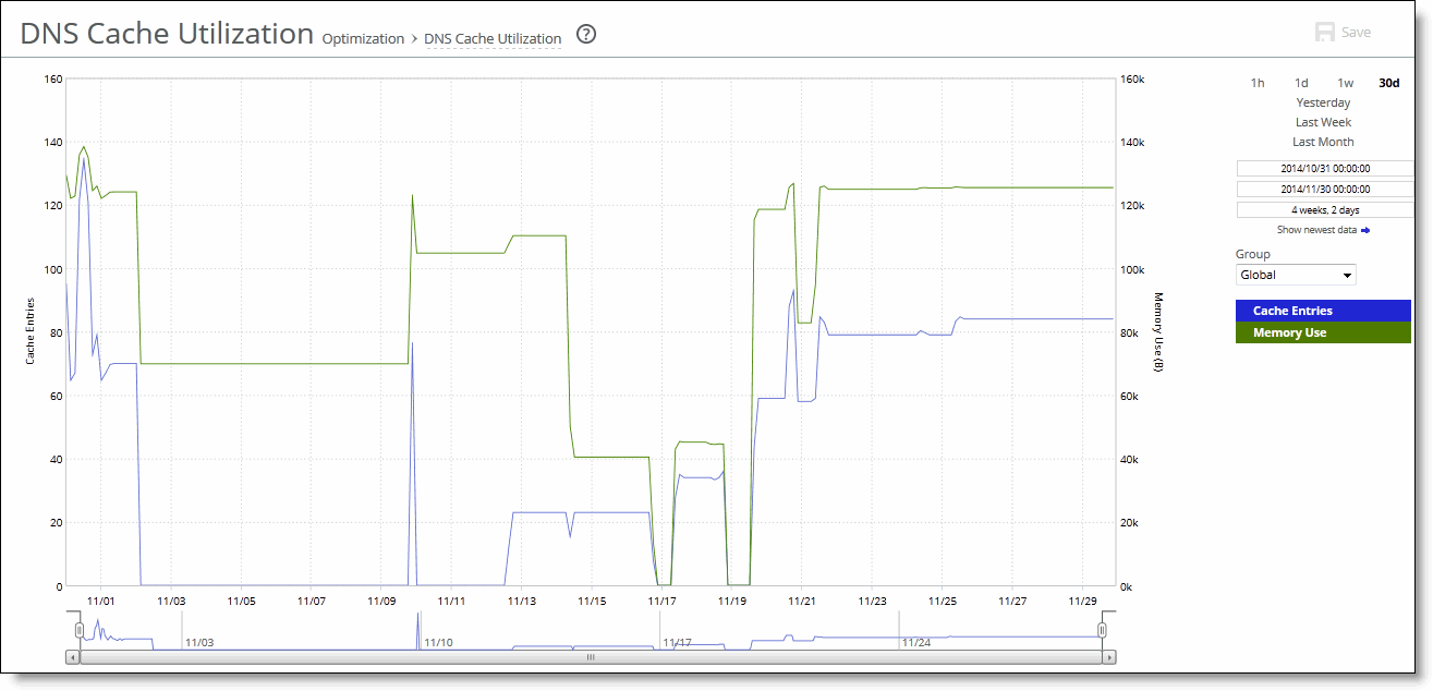 The DNS Cache Utilization report displays the size of the DNS cache in terms of DNS entries and bytes for the time period specified. You view the DNS Cache Utilization report under Reports > Optimization: DNS Cache Utilization. Time Interval and Group options are available to customize the report.