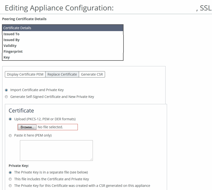 Under Appliance Configuration Pages, click SSL to display the Editing Appliance Configuration: <hostname>, SSL page. Select the Replace Certificate tab to expand the page.