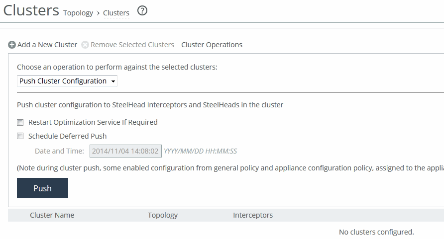 You can push cluster configuration settings to Interceptors and SteelHeads under Manage > Appliances: Clusters.