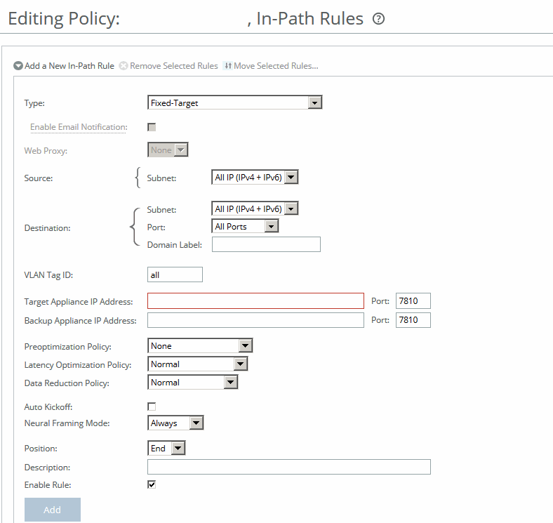 • Unselect the Enable Rule option for in-path rules in the accA policy definition to ensure that the appliance uses the accG in-path rules settings.