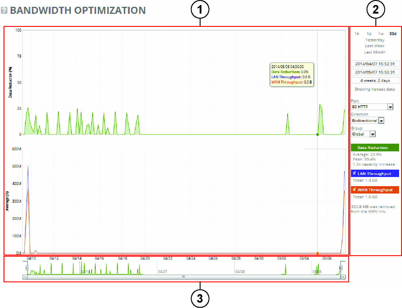 When a report display includes the total classes, the data series appear as translucent; selected classes appear as opaque. The navigator shadows the total sent series. When the report display includes selected classes and remote sites, the navigator shadows the first nonempty sent series. A data series can be empty if you create a QoS class but it hasn’t seen any traffic yet.