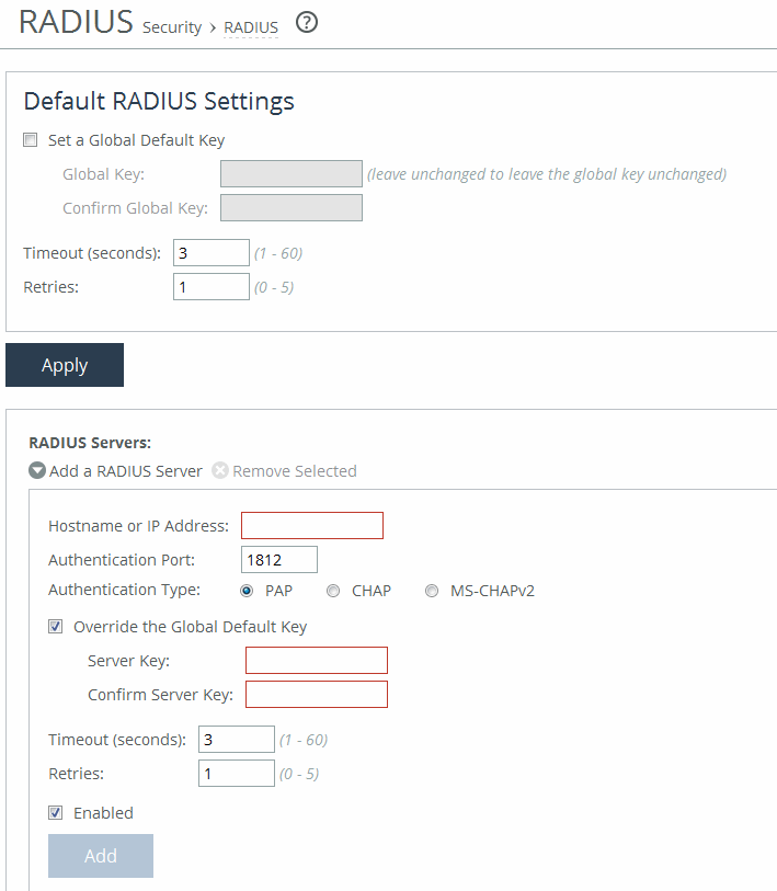 You set RADIUS server authentication under Administration > Security: RADIUS. RADIUS is an access control protocol that uses a challenge and response method for authenticating users. Setting up RADIUS server authentication is optional. Enabling this feature is optional.