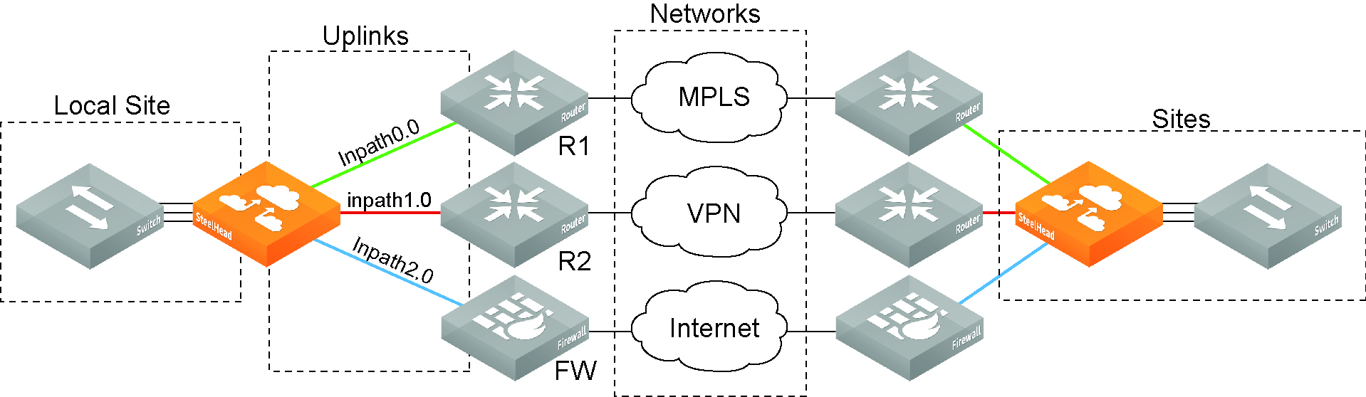About site types. • Uplinks—Define the last network segment connecting the local site to a network. You define carrier-assigned characteristics to an uplink: for example, the upload and download bandwidth and latency. An uplink must be directly (L2) reachable by at least one SteelHead or Interceptor in the local network. An uplink doesn’t need to be a physical in-path connection. Path selection uses only local uplinks. SteelHeads deployed in hybrid networks send ICMP probes on uplinks to establish contact with the appliances in the network. This uplink probing frequency can affect the scaling and performance of hybrid networks. Path selection rule-aware probing improves deployment scalability of hybrid networking. For details, see