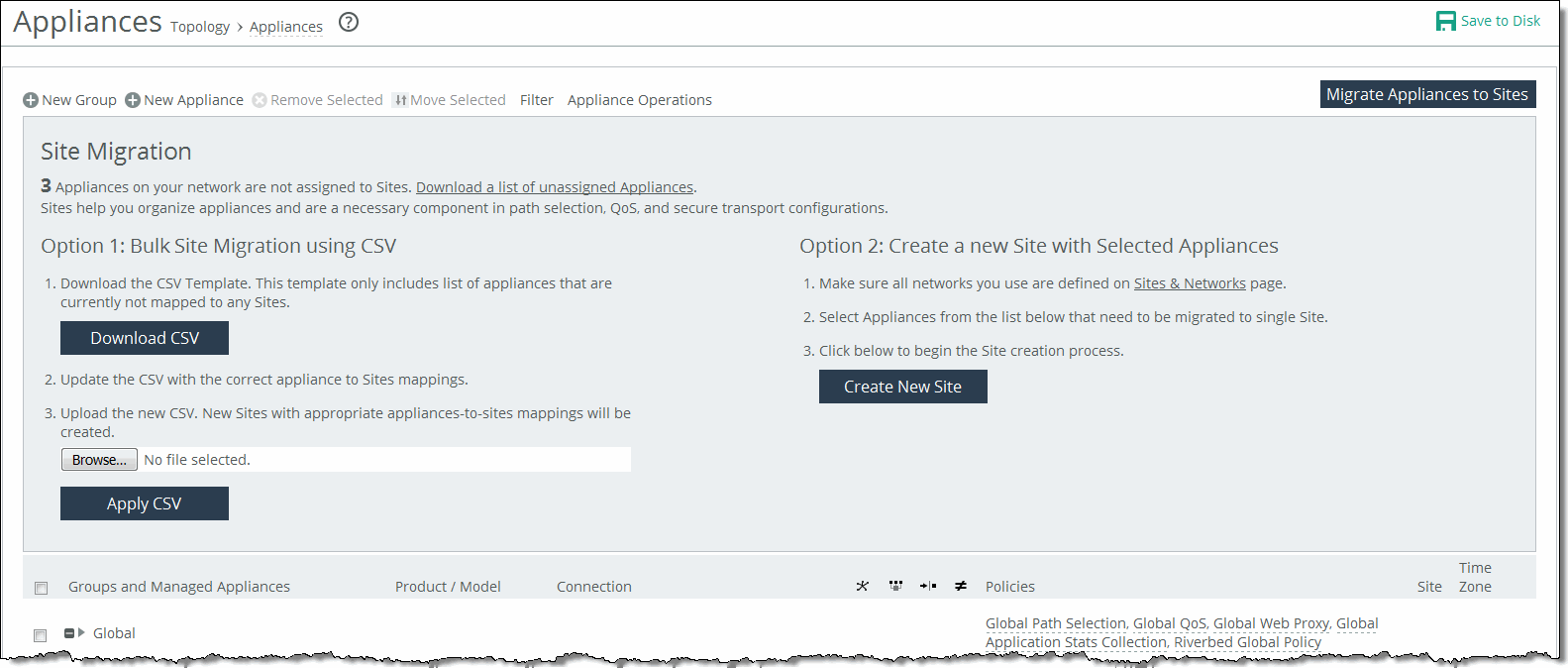 2. Click Migrate Appliances to Sites to display the Site Migration page.