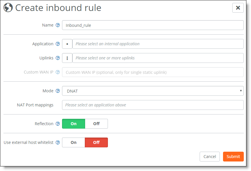 •Inbound access control rules - Define the policy for external (internet) access to internal applications. Inbound rules offer optional support for NAT, port translations, and an external host whitelist.