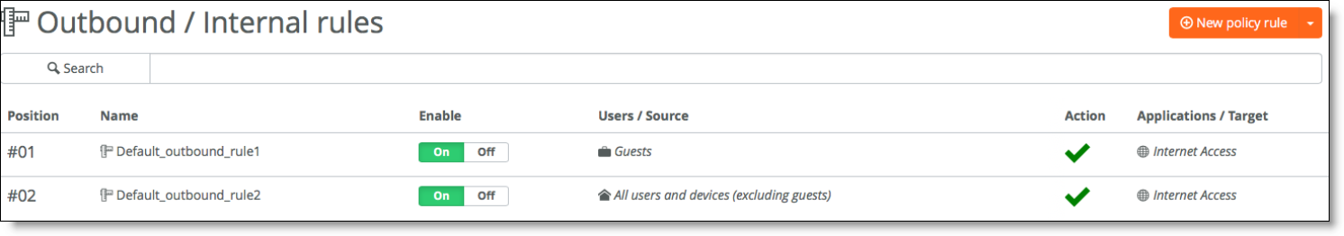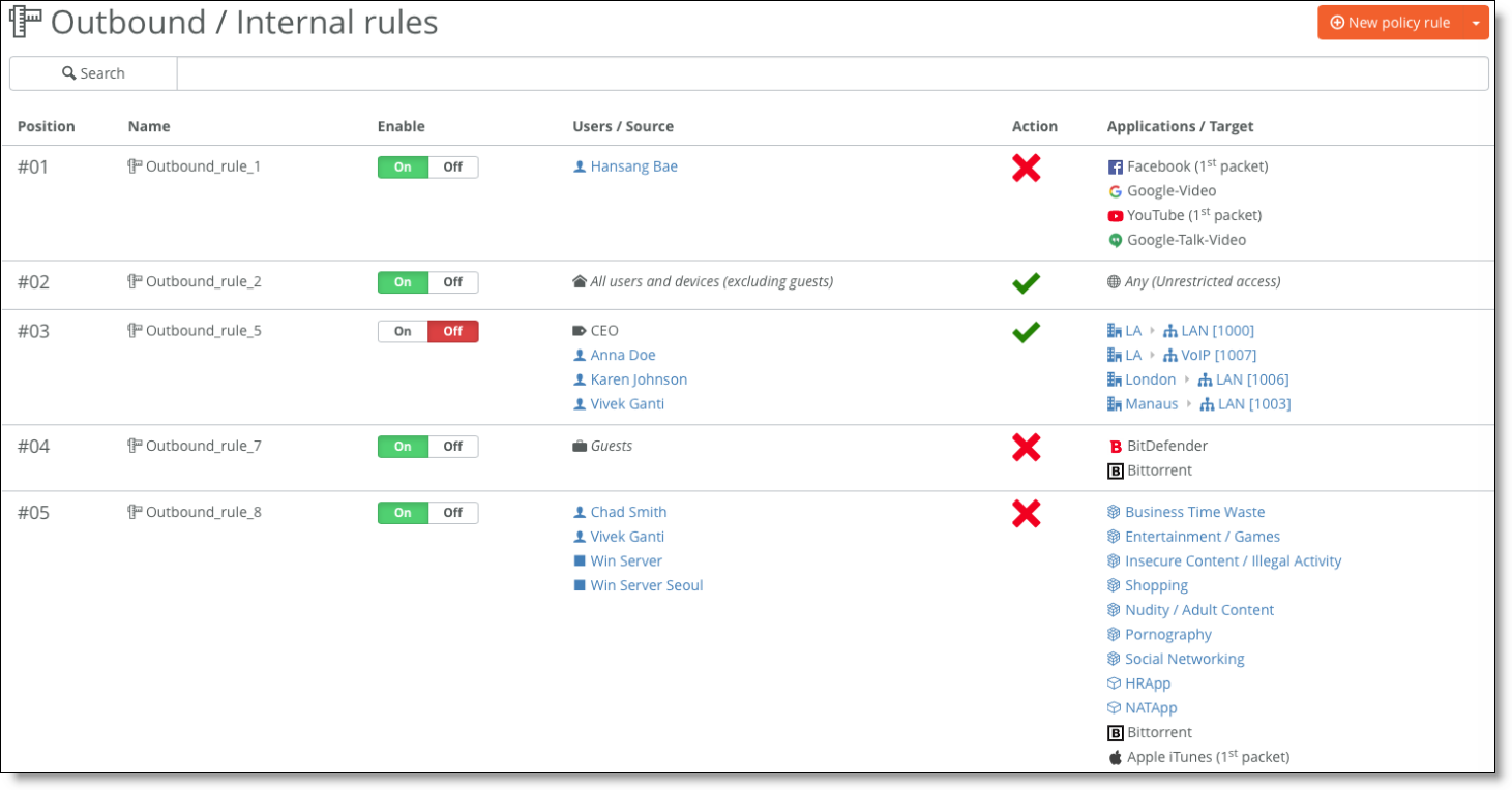 •Allow/deny firewall rules - Define the policy for internal users and devices accessing internal or external applications.
