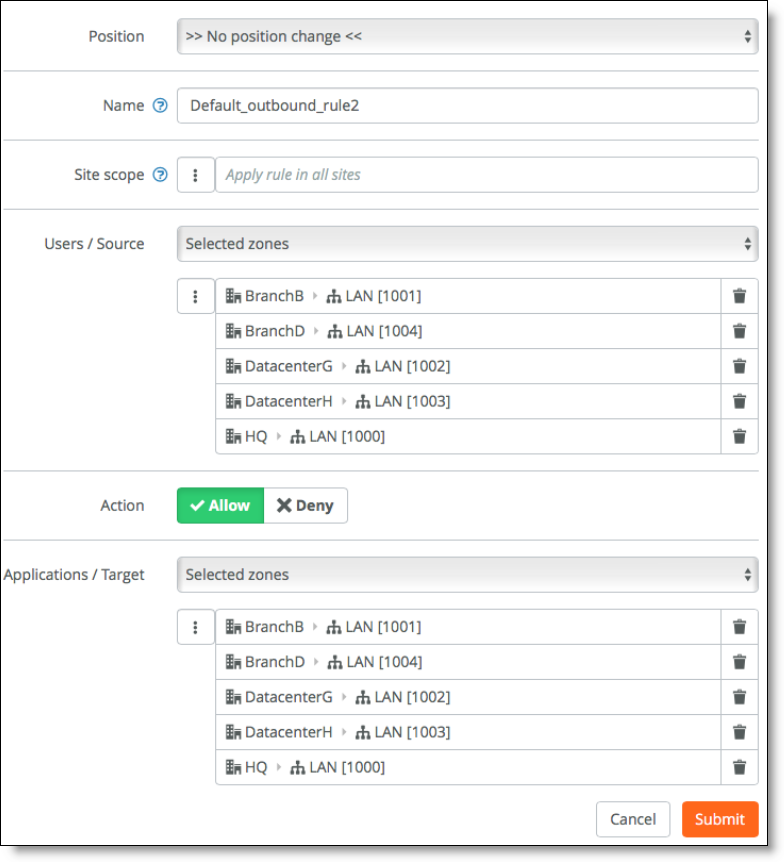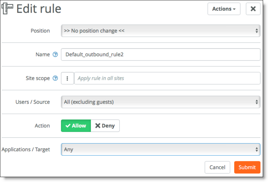 The outbound and internal rules specify a source, a target, and an action. The source can be either a special catch-all selection (such as all registered users) or a custom selection of user groups, device groups, individual users, individual devices, or policy tags. We recommend that you base the outbound and internal rules on user groups and device groups, and then make exceptions using policy tags.