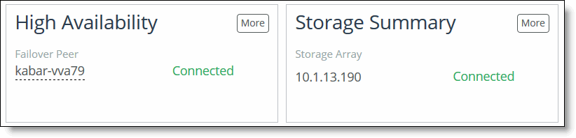 • Storage Summary - Displays an overview of storage arrays connected to this Core, as well as their connection status. Click More to view details on the iSCSI, Initiators, MPIO page. The information in this panel will change depending on the type and number of connected storage arrays: