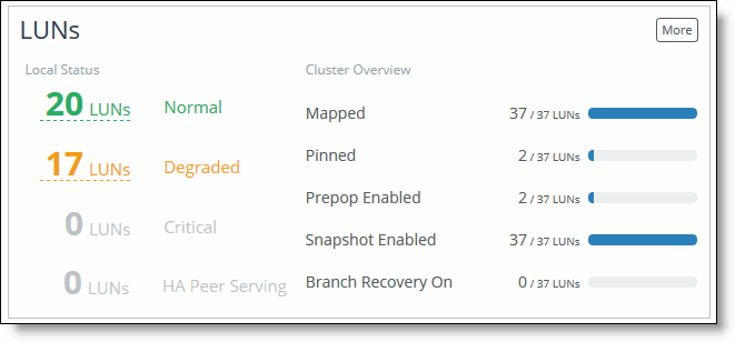 • LUNs - Displays the total number of LUNs and their current health state: Normal, Degraded, Critical, or HA Peer Serving. In addition, this panel displays the features currently enabled or configured on these LUNs, such as prepopulation, snapshots, branch recovery, or whether the LUNs are mapped or pinned. If LUNs are not configured, click Add a LUN to add a LUN to this Core. Click More to view details on the LUNs page.