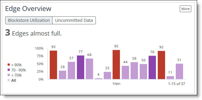 • Edge Overview - Displays an overview of the Edges connected to the Core. Select the Blockstore Utilization tab to display the percentage of the blockstore currently being used at each Edge. Select the Uncommitted Data tab to display the percentage of blockstore data that is pending to be committed to the Core. Click More to view details on the SteelFusion Edges page.