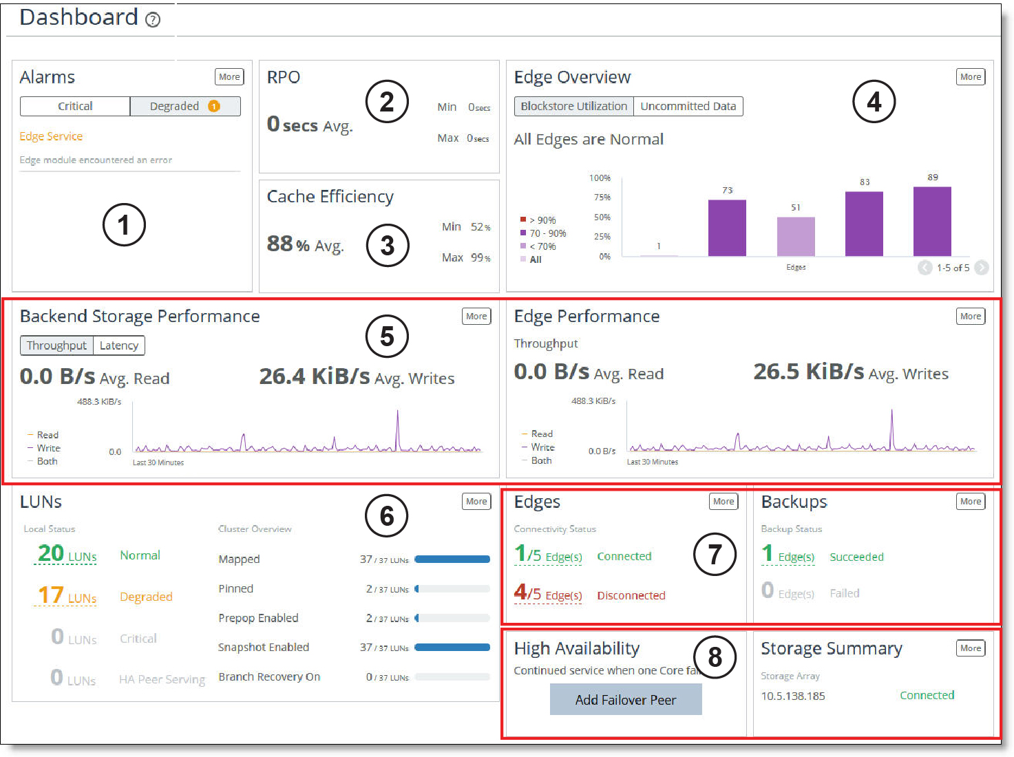 The Dashboard displays a dynamic, at-a-glance view of how your entire Edge and storage infrastructure is performing, organized in various panels. Data is refreshed every 60 seconds.