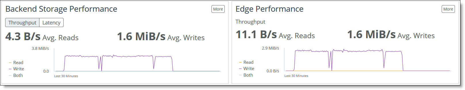 • Edge Performance - Displays the last 30 minutes of performance, measured in total read and write throughput, for all Edges connected to this Core (and the peer Core, if HA is configured). Click Read, Write, or Both to customize the view. Click More to view details on the SteelFusion Edges page.