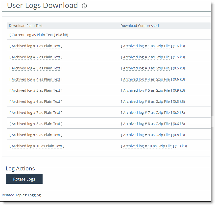 3. Click Rotate Logs to manually archive the current log to a numbered archived log file and then clear the log so that it is empty again.