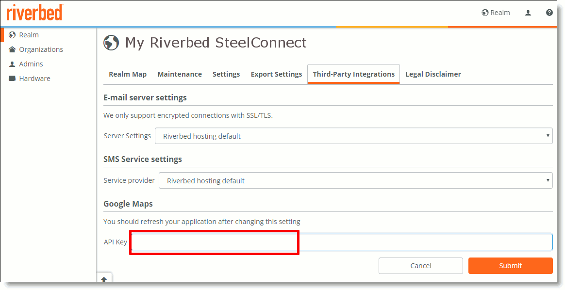 –At the Realm level in SCM, select the Third-Party Integrations tab and paste the API key you received in the API Key field (highlighted in red in this figure).