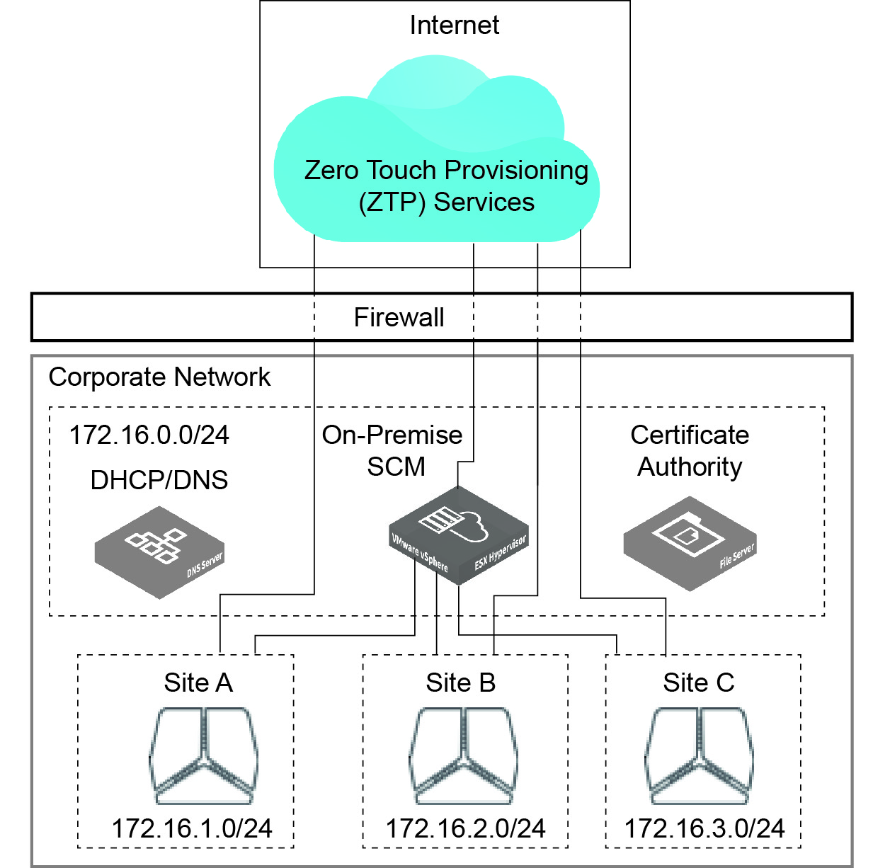 Simplified On-Premise SCM topology shows a domain name server (DNS) and a Dynamic Host Configuration Protocol (DHCP) server in the corporate network. Make sure these servers are reachable from the On-Premise SCM and from all three sites.
