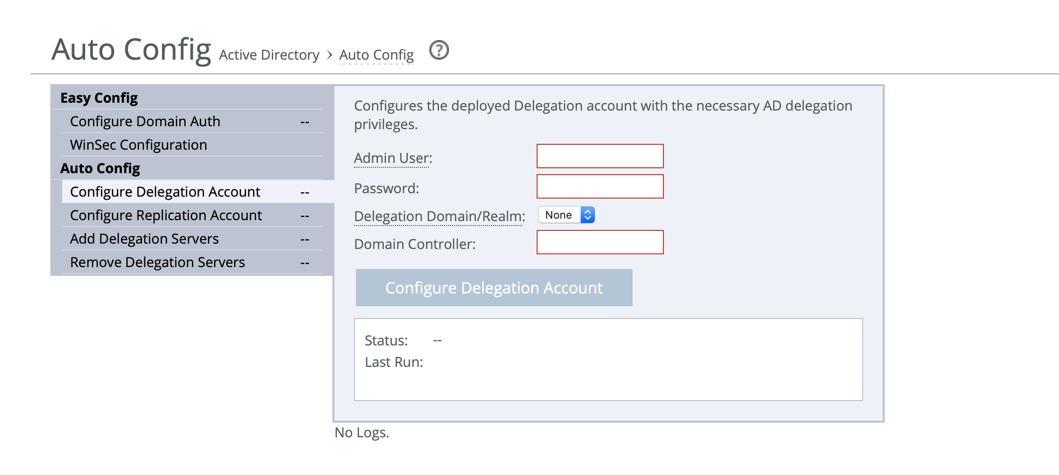 – Configure Delegation Account—Configures the deployed delegation account with AD delegation privileges. This is a legacy configuration that has been deprecated.