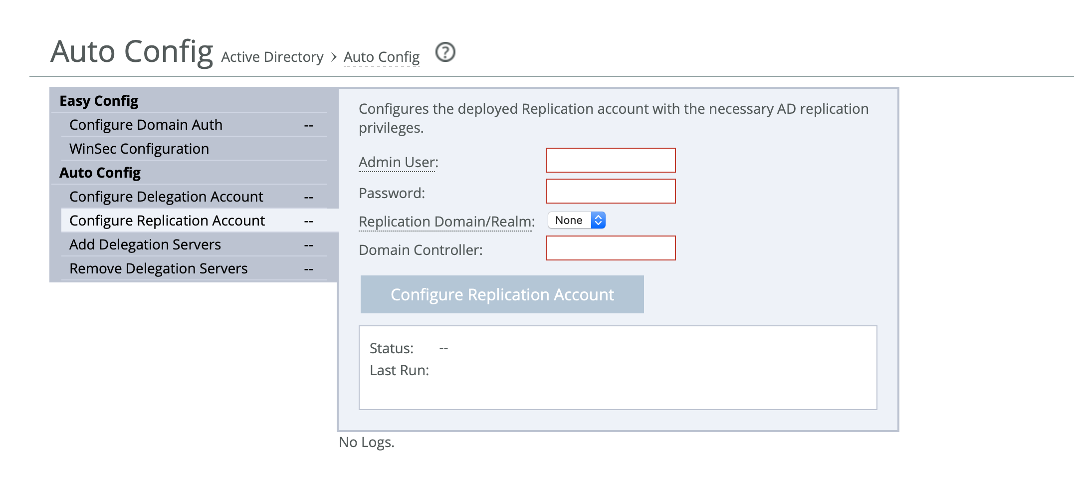 – Configure Replication Account—Configures the deployed replication account with AD replication privileges.