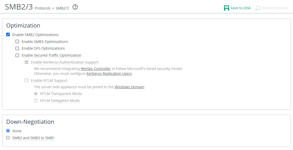 SMB2 and SMB3 to SMB1 | Enable this control on the client-side SteelHead. Optimizes connections that are successfully negotiated down to SMB1 according to the settings on the Optimization > Protocols: CIFS (SMB1) page. RiOS bypasses down-negotiation to SMB1 when the client or the server is configured to use only SMB2/3 or the client has already established an SMB2/3 connection with the server. If the client already has a connection with the server, you must restart the client. Down-negotiation can fail if the client only supports SMB2 or if it bypasses negotiation because the system determines that the server supports SMB2. When down-negotiation fails, bandwidth optimization is not affected. . |