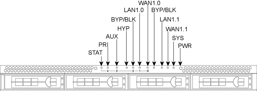 LAN-WAN | Left LED Link = Green Activity = Blinking green Right LED GB = Orange 100 MB = Green 10 MB = No light BYP/BLK Normal = No light Bypass or Block (Disconnect) = Orange |