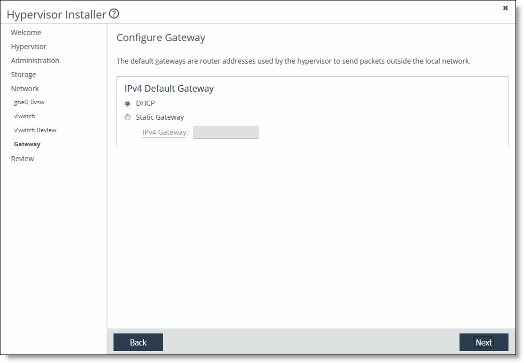 1. Select an IPv4 or IPv6 gateway, or both. The gateway field is available only for the interface that is currently selected as the hypervisor management interface. Select DHCP or specify a static IP gateway. If you select a static gateway, specify an IP address.