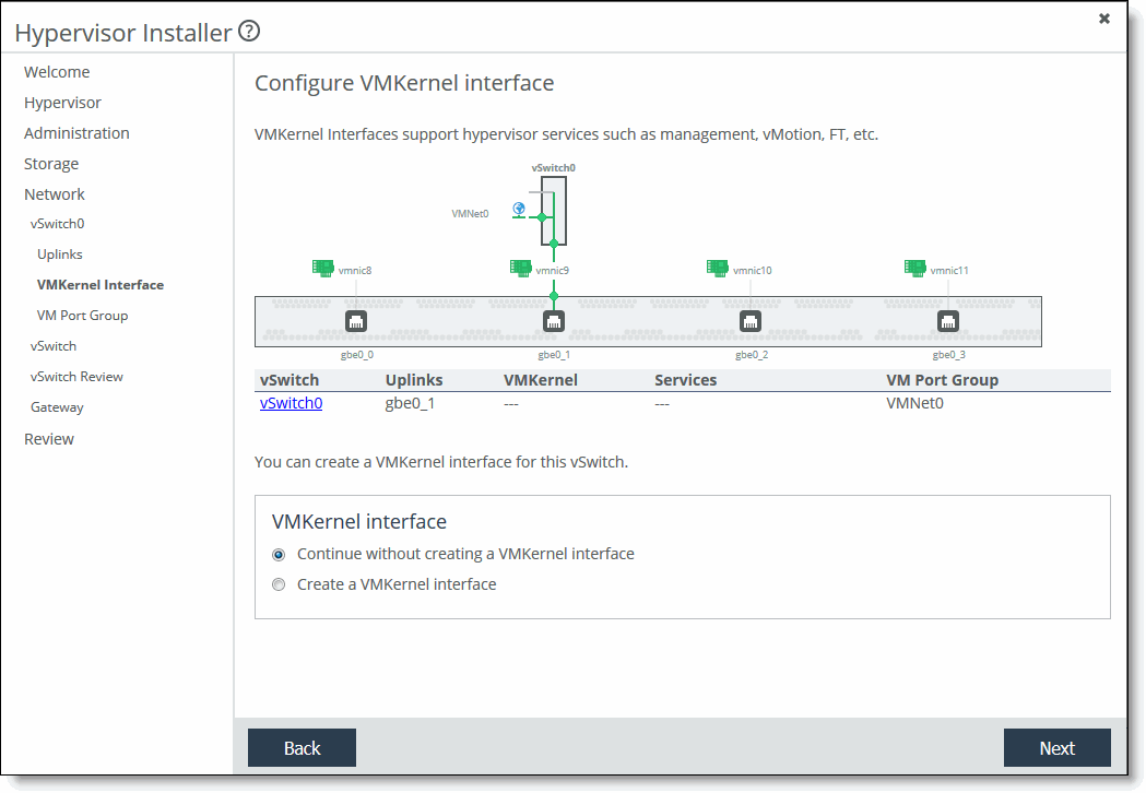 6. Select Continue without creating a VMKernel interface and skip to Step 8 or select Create a VMKernel interface.