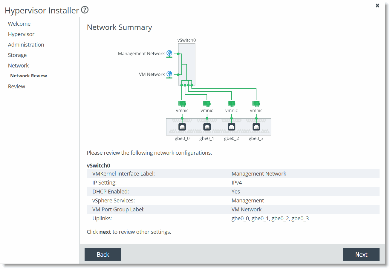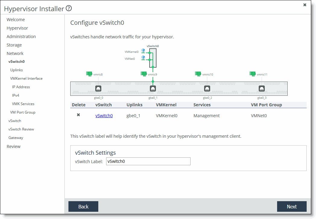 17. Click Next. The vSwitch Review page reappears. Review the vSwitch settings.