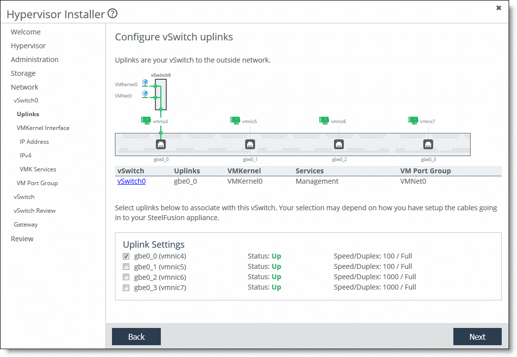 – attaches all onboard hypervisor NIC uplinks to the vSwitch (the number of uplinks depend on the appliance model), but excludes add-on NICs for the hypervisor node. You can configure add-on NICs for the hypervisor node through vSphere.