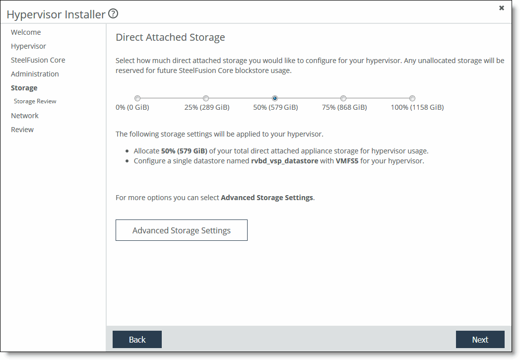 1. Select the amount of attached storage to allocate to the hypervisor or keep the default value of 50 percent. You can use up to 100 percent of the datastore, but if you connect a Core to project LUNs in the future, writes to remote LUNs could experience lower throughputs and low or no space conditions.