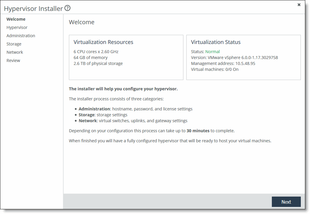 The Hypervisor Installer guides you through setting up your hostname, password, network settings, storage, and vCenter license (if applicable) and pushes these settings to the hypervisor configuration. Depending on your configuration, this process can take up to 30 minutes to complete. The hypervisor status must be Ready to Install, Normal, or Limited Qualification - VSP Managed before running the installer.