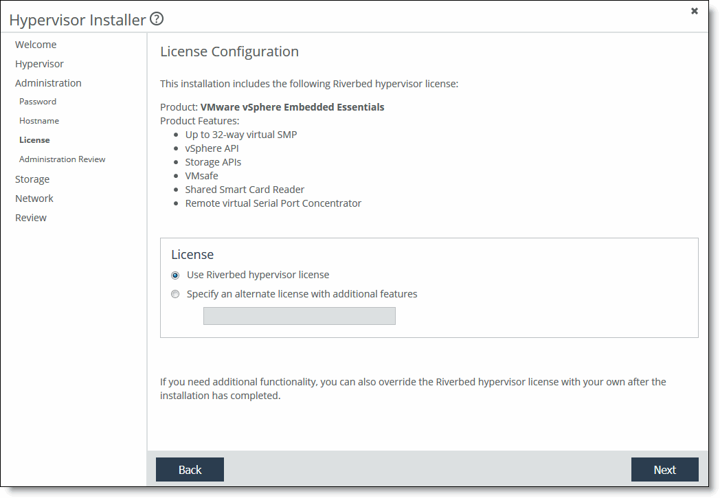 11. Select the Riverbed license or select Specify an alternate license with additional features and specify your own license.