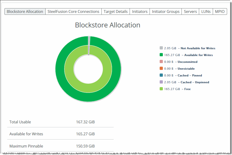 Select the Blockstore Allocation tab to display information about the Edge blockstore. It includes information about the LUNs: the amount of bytes currently free, the bytes cached in the blockstore, and an estimate of the number of bytes that can be written to the cache before the cache is at maximum capacity. This tab also shows the amount of space in the blockstore used for pinned LUNs.