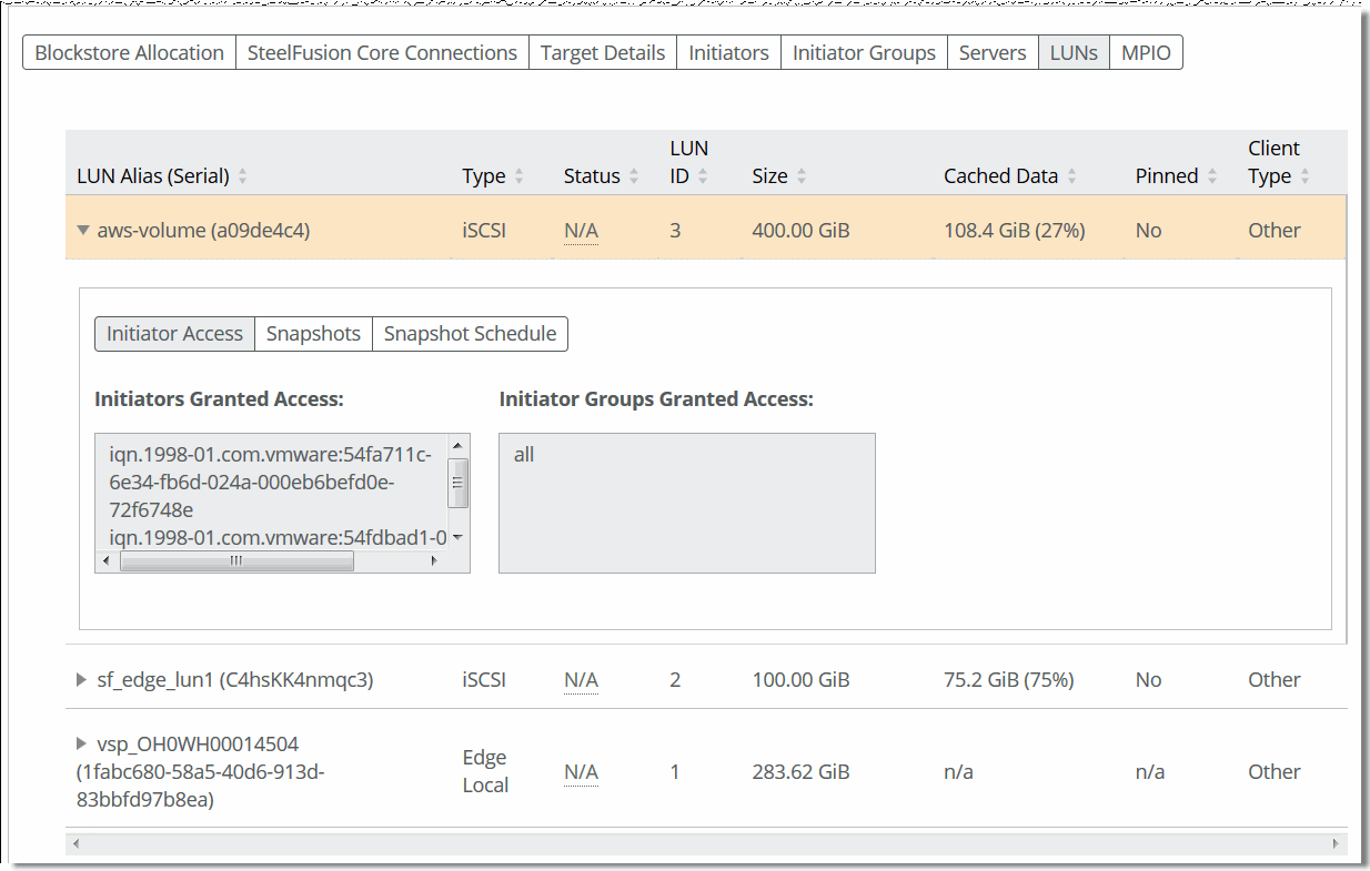 The tab also displays whether a LUN is pinned. Pinned LUNs use dedicated space in the Edge to store production data. The space required and dedicated in the Edge blockstore cache is equal to the size of the LUN provisioned at the data center. This allows the Edge servers to continue to operate and function even during WAN outages, because 100 percent of data is kept in Edge blockstore cache. Like regular LUNs, the data is replicated and synchronized with the associated LUN back at the data center.