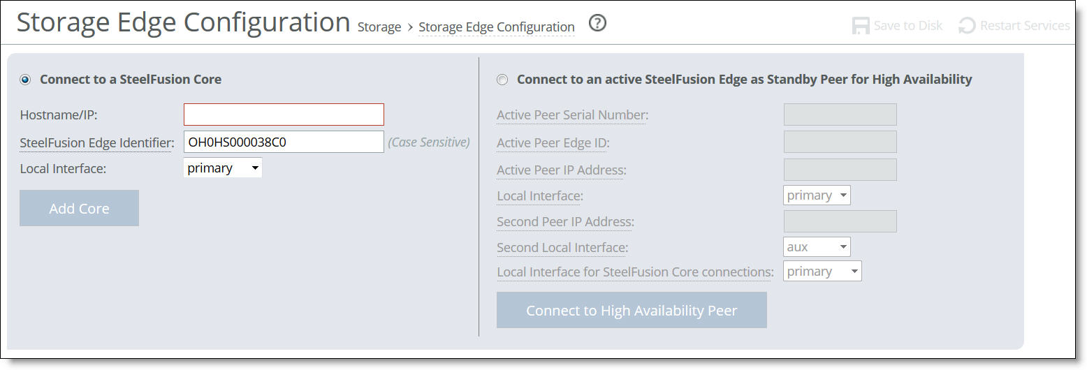 You connect an Edge to a Core in the Storage > Storage Edge Configuration page. You can also optionally connect the Edge as a standby peer for high availability.