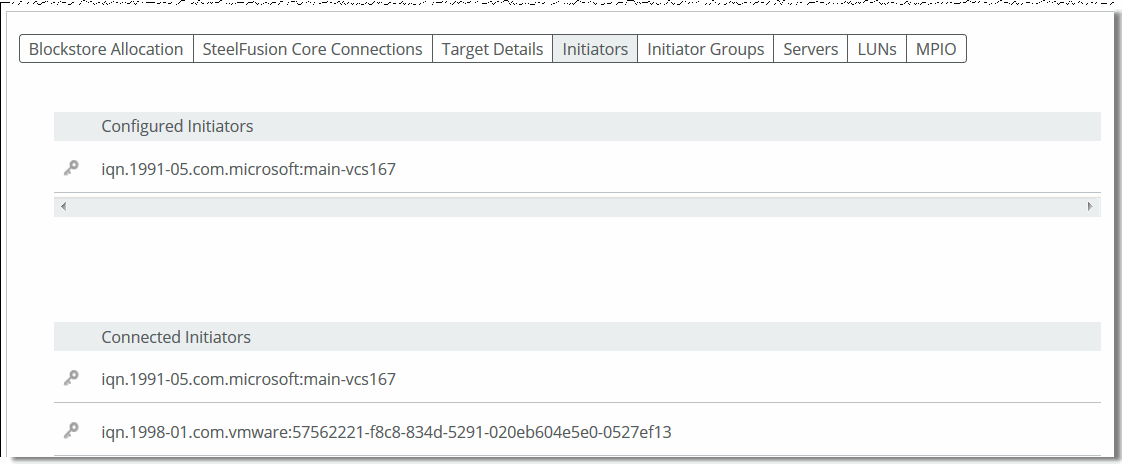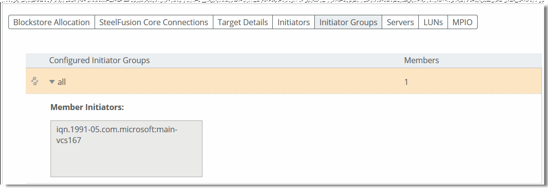 Select the Initiator Groups tab on the Storage Edge Configuration page to view groups and their member initiators. Core uses the concept of appliance storage groups, called initiator groups. This common practice is also known as LUN masking or storage access control. Initiator groups are a way for storage administrators to group LUNs according to the parameters of the environments or servers they serve. We recommend configuring initiator groups on the Core to only group iSCSI initiators that need to access or modify the same LUN(s).