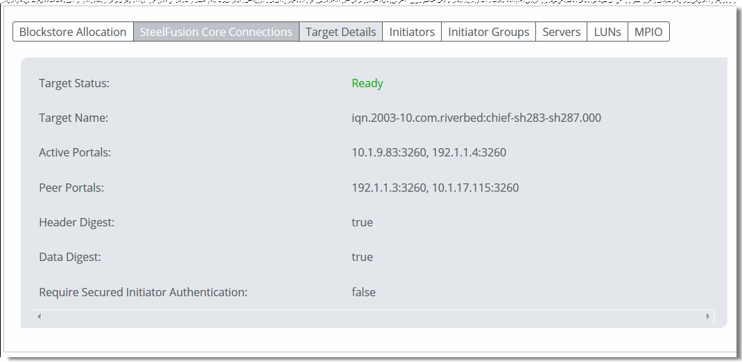 Select the Target Details tab on the Storage Edge Configuration page to display information about the iSCSI targets and portals.