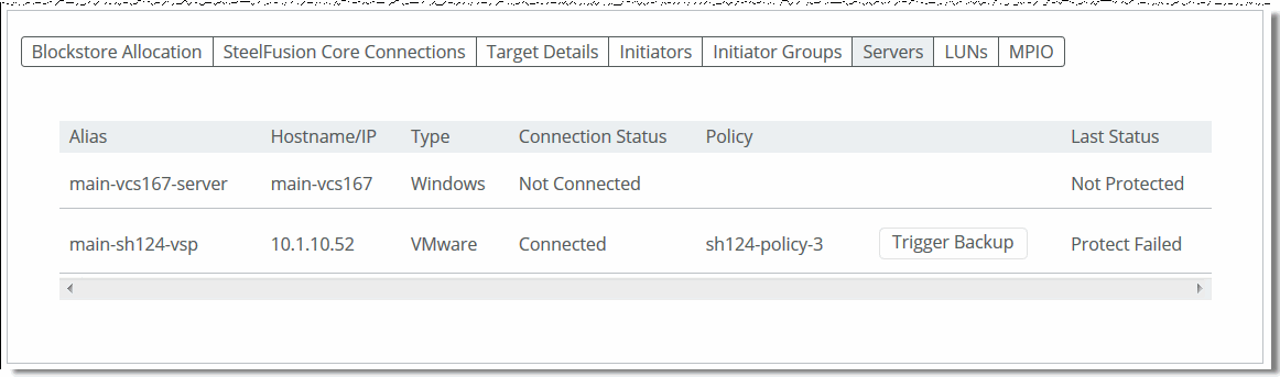 If you have configured server-level backups, a manual backup for any server that is added to a backup policy must be triggered from the Servers tab (as opposed to the LUNs tab for LUN-level snapshots). Once the policy is triggered, the Last Status will change accordingly and the backup will appear in the Reports> Data Protection: Backups page in Core. If the Edges are in a high-availability configuration, you can only trigger backups on protected servers on the active Edge. For details on server-level backups, see the SteelFusion Core User Guide.