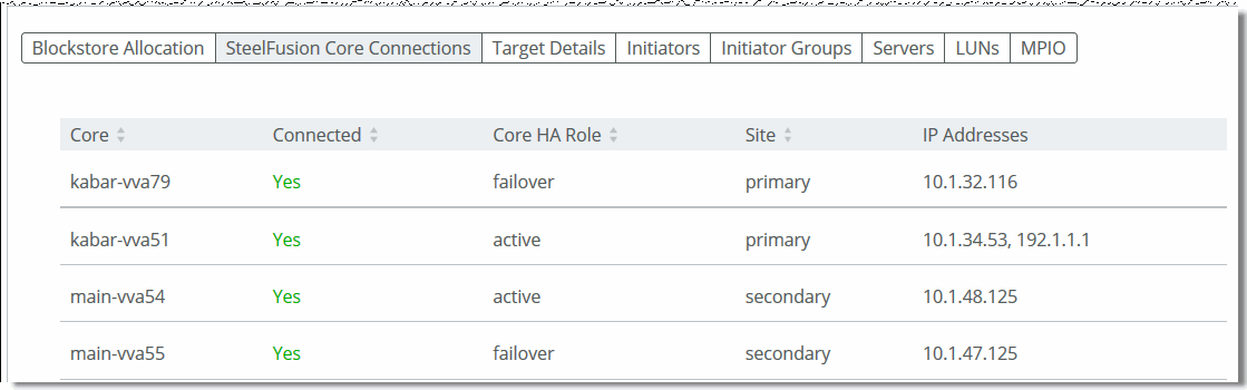 Select the SteelFusion Core Connections tab on the Storage Edge Configuration page to display information about the connected Cores, including connection status, Core HA role (such as active or failover), site, and IP address.