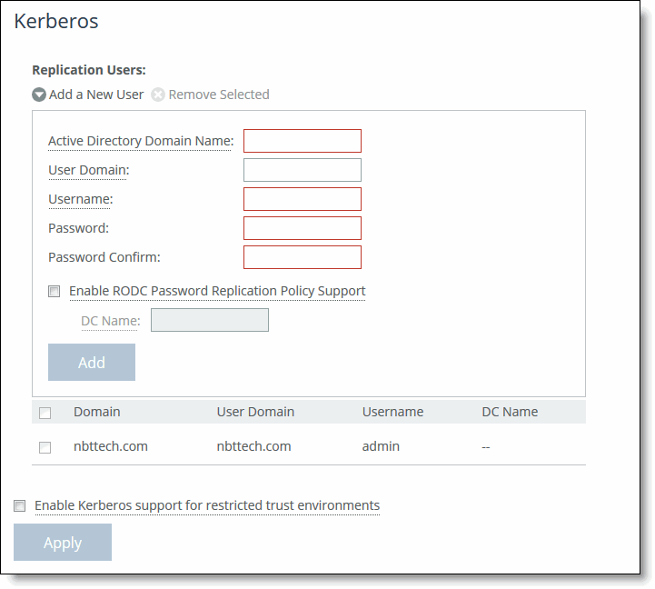 2. Under Kerberos Replication Users, complete the configuration as described in this table.