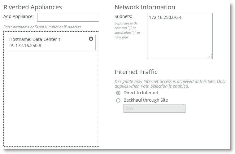 Figure: Branch office direct-to-internet configuration shows a configuration of the appliance at the site, network, and that internet access is directly available.