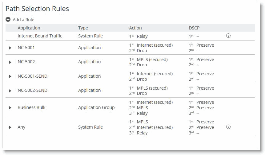To complete the path selection policy, you must create path selection rules on the SCC. In the example, traffic using TCP source port 5001 or TCP destination port 5001 is configured to use the MPLS-secure path and be dropped if that path is not available. Traffic using TCP source port 5002 or TCP destination port 5002 is configured to use the internet path and be dropped if that path is not available. All other traffic is relayed.