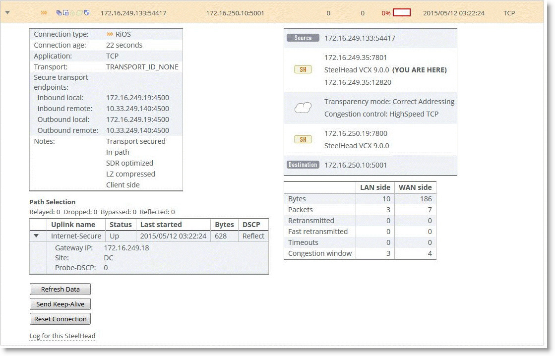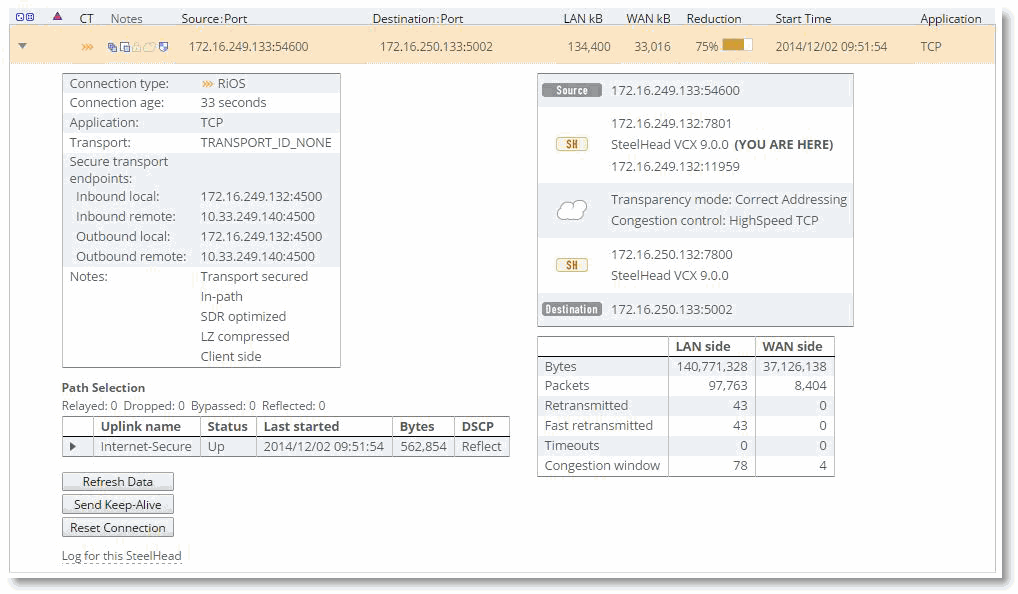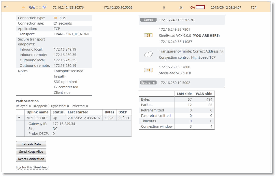 Figure: MPLS-secure path shows another connection that was optimized and path selected over the MPLS-secure path. This connection was also encrypted using secure transport but was not UDP encapsulated.
