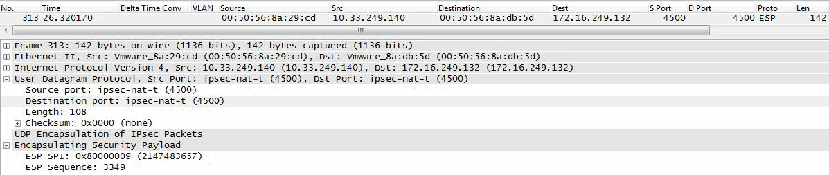 Figure: Details of NAT traversal shows packet details from the Wireshark display for an encapsulated packet using NAT traversal.