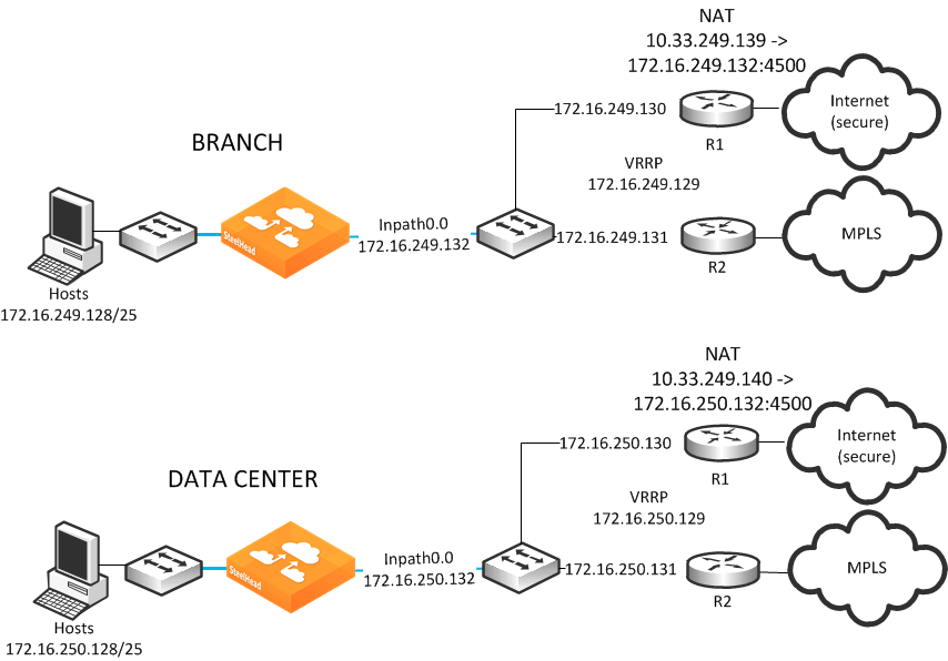Figure: Split tunnel example shows a single SteelHead located at the data center and a single SteelHead at the branch office. Each SteelHead has two in-path interfaces in which each in-path interface sits between a LAN router and a WAN edge router.