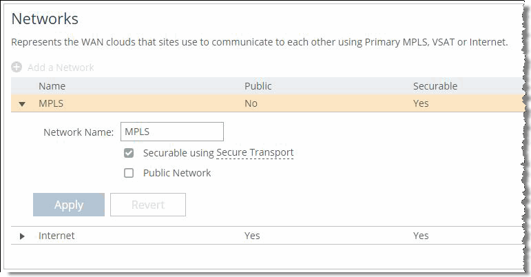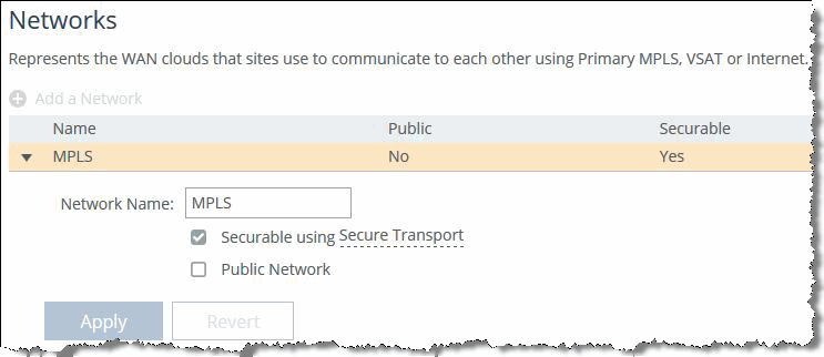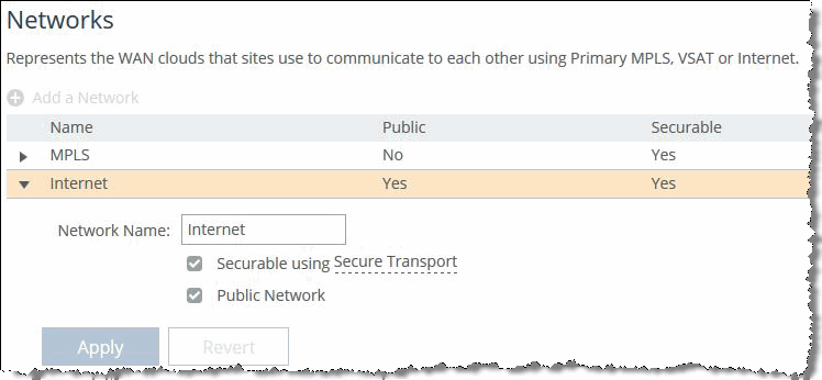 Figure: MPLS network show that the internet and MPLS networks are both marked secure while the internet network is also marked as public. The secure designations provide an internet-secure path and an MPLS-secure path to be created for applications to use. The public designation for the internet path allows for traffic to be UDP encapsulated and encrypted to traverse the NAT occurring at the internet WAN edge routers.