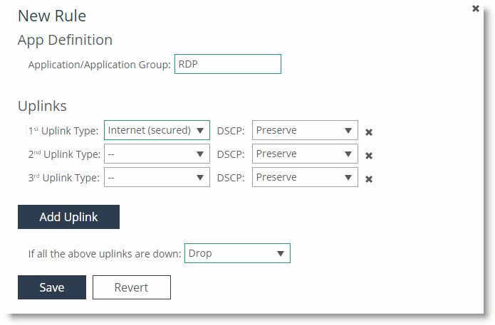 Figure: Secure path shows the RDP application as using the internet (secured) path. If the specified secured path is unavailable, then the SteelHead drops the traffic.