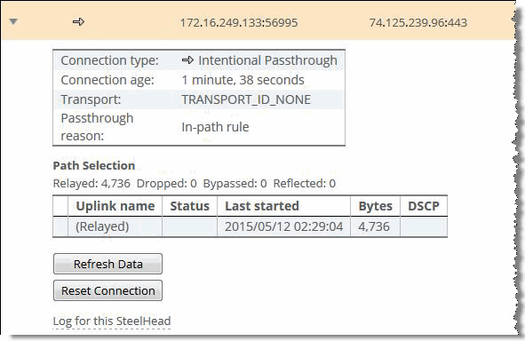 Figure: Traffic passing through shows how changing the in-path rules causes the connection to appear as intentional pass-through traffic and the same path selection action, relay, is performed.