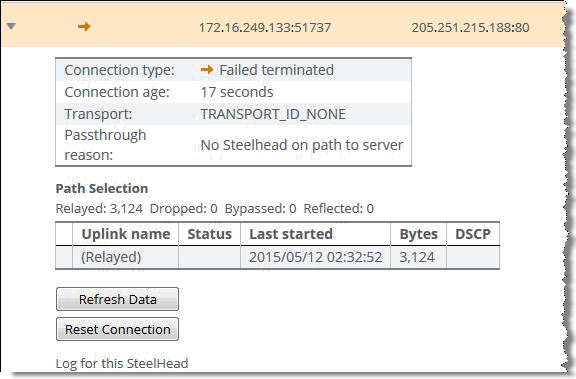 Figure: Failed terminated shows a connection that appears as Failed Terminated because the SteelHead attempted autodiscovery and there was no SteelHead on the path to the server.