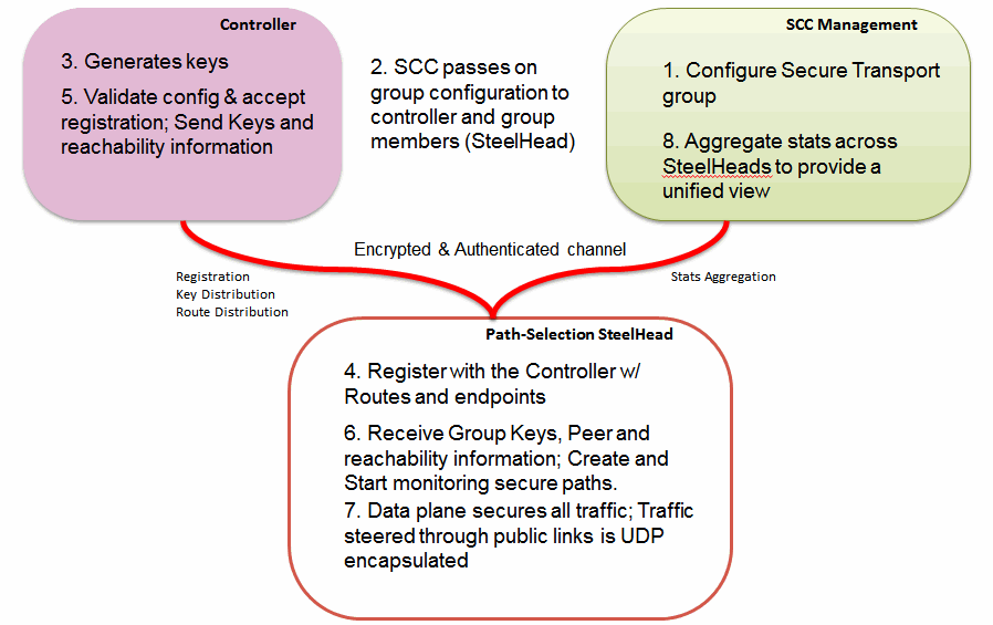 The SCC is not intended to be an internet-facing device. We recommend that you connect over a network path, controlled by your organization: for example, a private WAN such as MPLS or a third-party VPN connection. After the SteelHead communicates with the SCC, it receives information on how to reach the controller, registers with the controller, and then can perform encryption services for path selection.