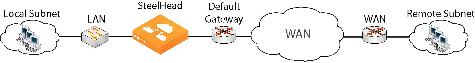 Figure: In-path configuration where default LAN gateway is accessible over the appliance’s WAN interface illustrates topologies where the default LAN gateway or router is accessible over the WAN interface of the SteelHead. If there are two clients in the local subnet, traffic between the two clients is routable after reaching the LAN gateway. As a result, this traffic traverses the WAN interface of the appliance.